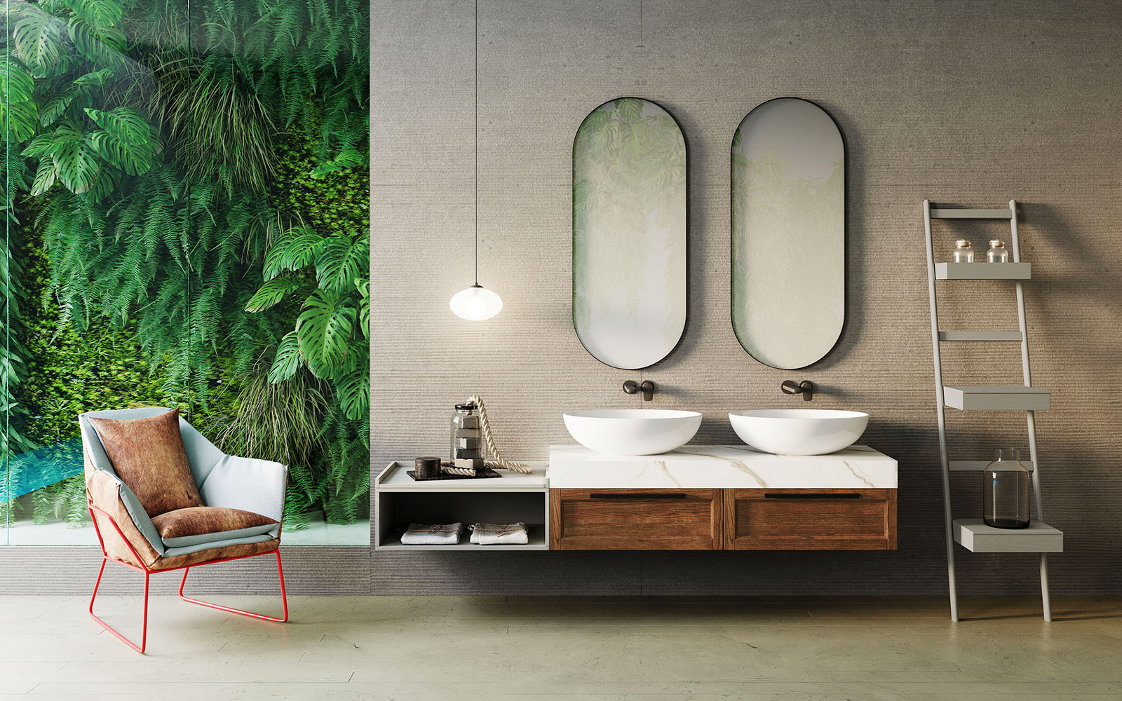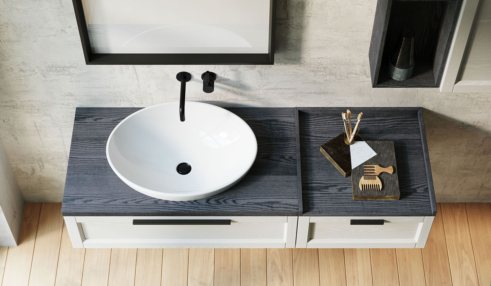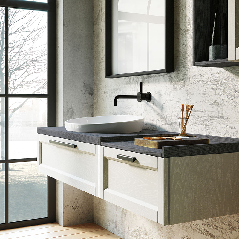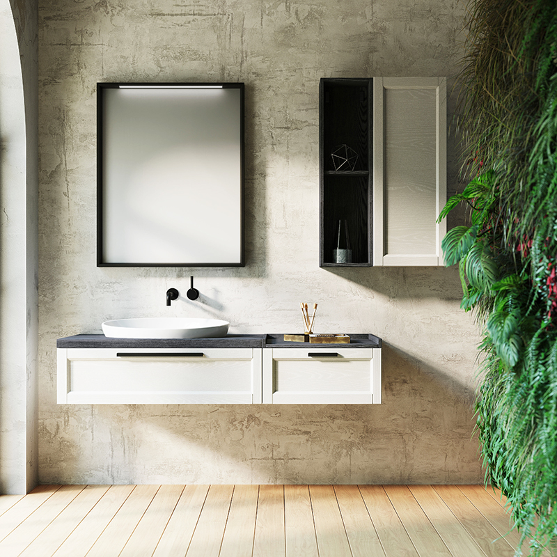 Frame: artigianalità romantica e design ricercato. Estetica classica e mood moderno si uniscono in uno spazio bagno originale e funzionale. Frame si distingue per il suo design sofisticato e l'attenzione ai materiali. Le linee sono riconoscibili, con venature sinuose che conferiscono un tocco elegante al frassino. La collezione offre molteplici opzioni di composizione, con basi, pensili e colonne. Elementi distintivi includono il colore nero, specchi con cornice in frassino e illuminazione LED integrata, TOP portatutto, mensole Koda che combinano ripiani e specchi, e mensole Versa adatte come contenitori e accessori per il bagno, ma anche utilizzabili come portasciugamani se montate al contrario.