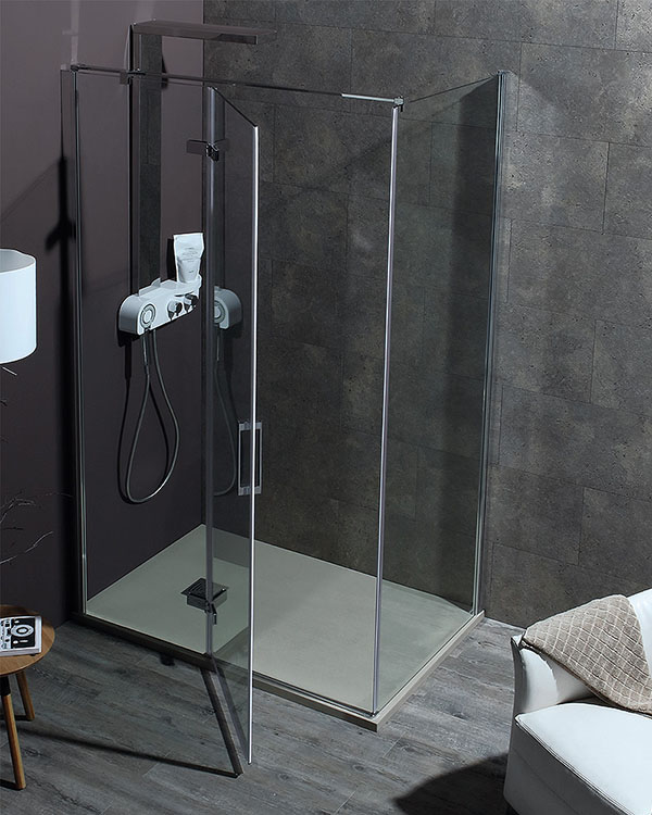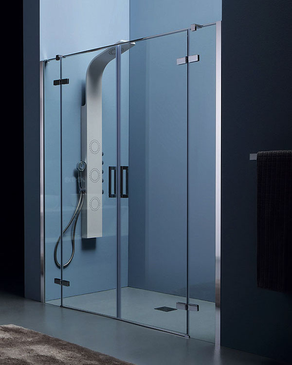 Il telaio a parete assicura stabilità e sorregge lo spessore del vetro fisso da 8 mm, grazie a due cerniere tecniche elimina il profilo, donando a questa cabina una trasparenza totale che mette in evidenza dettagli ricercati come la maniglia. Può essere installato sia su piatti doccia tradizionali che a filo pavimento o sovra pavimento.