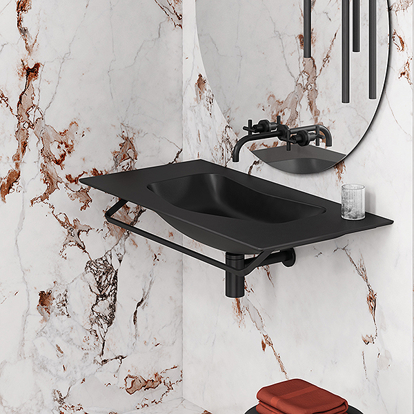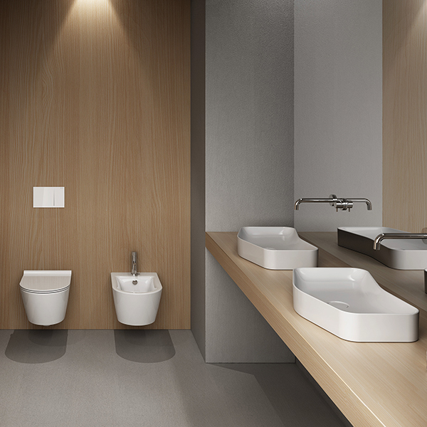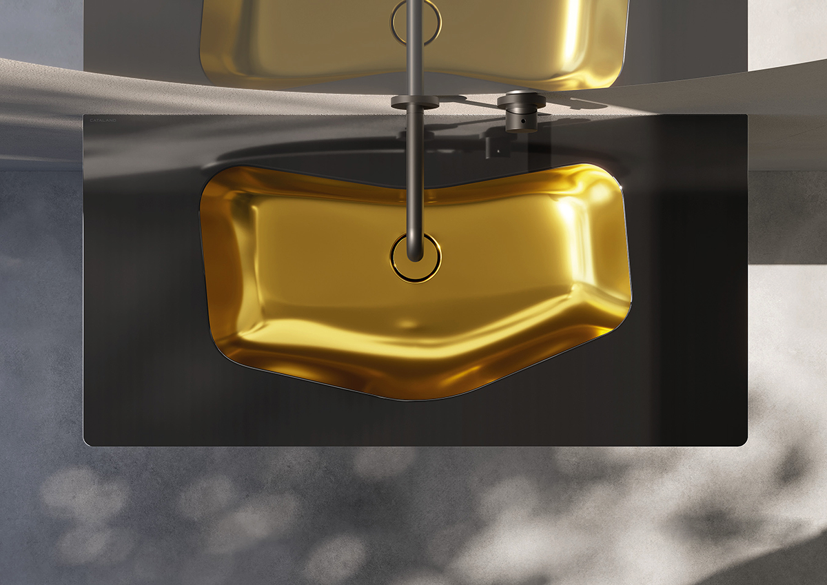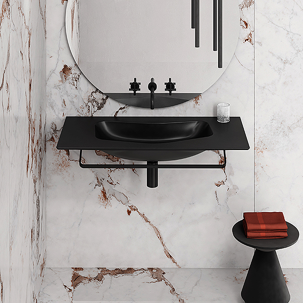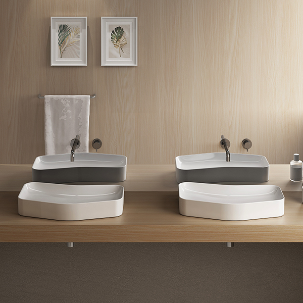 Un equilibri perfetto, ispirato agli anni Cinquanta e Sessanta del Novecento. Il contrasto tra le linee organiche del lavabo e la razionalità del rettangolo crea una nuova estetica, iconografica e riconoscibile.